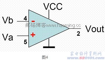 电压比较器主要是对两个模拟电压比较其大小,并判断出其中哪一个电压高,那一个电压低;并以输出高电平或低电平以显示比较的结果 如图4比较器符号所示。它有两个输入端:同相输入端Va(“+”),及反相输入端Vb(“-”),输出端Vout,输出端是输出;两个输入端比较的结果的电平信号。另外有电源V+及地(这是个单电源比较器)。