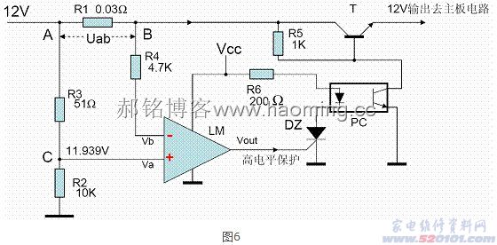 在图6是12V过流保护电路,图中;LM是比较器;Va作为比较器的基准电压输入端;R2、R3是基准电压的分压电路,根据图中R2、R3的分压比(51欧/10K欧);Va端电压为11.939V。R1是负载电流取样电阻;R1串联在负载的电流电路中,R1两端A和B之间的电位差Uab随负载电流的变化而变化。由于A端是开关电源的12V输出;是稳定的,当负载电流发生变化时B点点位随之相应变化。负载电流大;B点电位下降,负载电流减小;B点电位上升。负载电流为零时;B点电位等于A点电位。B点这个变化的电位作为取样信号;经过R4加到比较器的输入端Vb端。