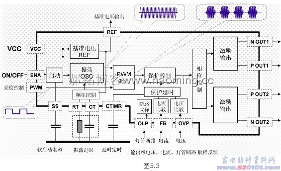 振荡控制电路主要包括振荡器、调制器、激励输出、保护控制电路,位于背光板的输入控制接口和功率放大电路之间,其主要功能如下: