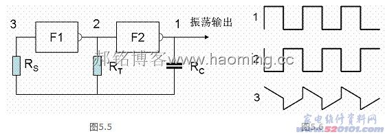 与非门多谐振荡器的等效电路如图5.5所示,F1和F2是两个反向器,RT、CT是振荡频率的定时元件,各部分的振荡波形如图5.6所示。该振荡器输出方形波,也正好符合要求。作为集成电路,该振荡器的频率、幅度、温度的稳定性仍然是很高的,是非常优秀的背光板驱动信号源,并且频率可人为设置(改变RT、CT的值就可以改变振荡频率)、外电路简单。图5.4所示集成电路中设置有基准电压REF,由VCC降压稳压形成,向振荡定时元件RT和CT提供充放电的基准电压,电压大小直接影响频率的高低,电压的稳定性也直接影响频率的稳定性。一般集成电路基准电压的稳定性极高,一般在2.5~5V范围内(不同集成电路的值不同),而其他部分的基准电压也取自REF基准电压,例如保护控制电路比较器的基准电压。