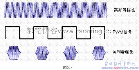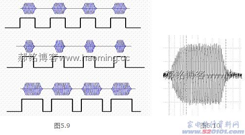 于是,三极管Q的集电极输出一串断续的高频振荡波群,每个高频波群的宽度正比于PWM信号的正半周,并随PWN信号正半周宽度的变化而变化。当CPU改变PWM亮度控制信号的占空比时,输出高频振荡波群的宽度也相应改变,从而达到控制亮度的目的;采用不同占空比的PWM亮度控制信号,断续高频振荡波包络宽度也不同,如图5.9所示。
