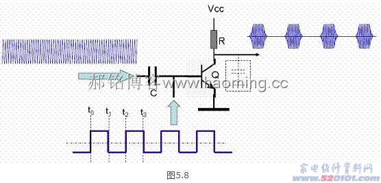 调制是一个很简单的过程,等效电路如图5.8所示。Q是一个普通的NPN型晶体三极管,电路是共发射极形式。振荡电路送来的高频等幅波及CPU送来的PWM亮度控制信号都同时加到Q的基极,调制后的信号由Q的集电极输出。三极管Q没有设置偏置电路,调制原理如下。