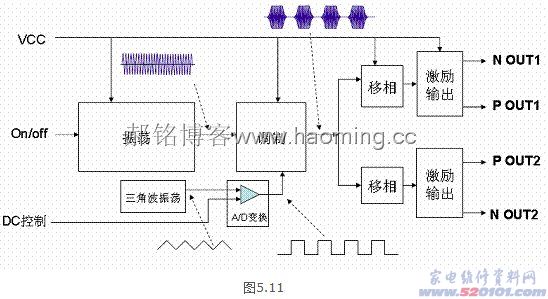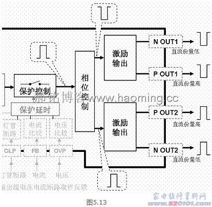 图5.13是信号分配及反相的简单流程图。由调制电路来的信号,经相位控制电路分相变为彼此反相180°的两路信号,分别送入两组激励输出电路。其中,上激励输出电路输出的是N-OUT1及P-OUT1,支持全桥电路的一对互补MOS管;下激励输出电路输出的是N-OUT2及P-OUT2,支持全桥电路的另一对互补MOS管,完成全桥功率放大的激励任务。