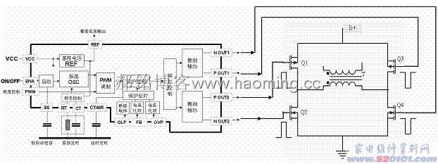 CPU送来的ON/OFF信号经ENA引脚进入集成电路内部的启动电路,软启动电路控制振荡电路开始工作。ENA(Enable)的含义是“使能”,就是允许的意思,即允许启动或允许停止。“SS”(Soft start)是软启动的意思(改变此引脚外接电容器的容量大小,即可改变软启动的时间),软启动的目的是使后级输出在开机的瞬间不至于产生电压的突变,减少对后级电路元件及CCFL灯管的冲击。