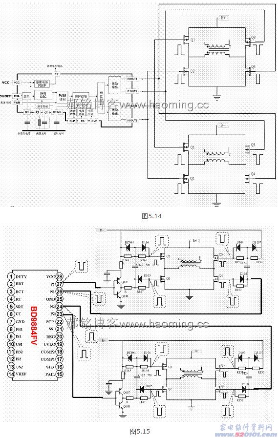 罗姆公司提供的相关资料显示,26脚、27脚输出信号是同相位关系。支持一组全桥功率放大电路需要两对(4路)反相信号,要用26脚、27脚支持一组全桥功率放大电路就必须产生一组反相信号并解决N、P沟道MOS管的栅极电位差问题,这两点图5.15所电路都做到了。