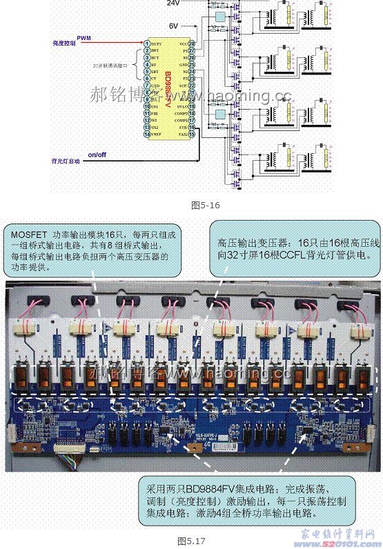 图5.16是一款三星32寸屏的背光板电路,采用一块BD9884FV驱动四组全桥功率放大电路,每组全桥功率放大电路承担两只升压变压器的激励驱动,一只BD9884FV完成了8只CCFL灯管的驱动工作。对于16只CCFL灯管的32寸液晶屏,用两只这样的集成电路就可以了。