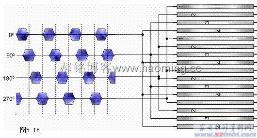 对于多灯管屏的亮度控制,如果灯管在同瞬间供电,PWM的间断频率会和液晶屏的刷新频率产生差拍,导到处液晶屏出现滚道干扰、闪烁、亮度不均匀等现象。为了防止这种现象,多灯管屏一般把灯管分为4组,供电系统采用4个通道输出4路经过PWM调制的高频脉冲波,每个通道向一组灯管供电,通道之间输出的PWM调制脉冲依次移相900(在一个PWM周期内),使4组灯管达到轮流断电、供电,使亮度更均匀、干扰最小。图5.18左边是背光板输出的具有900相位差的4组高压,每组输出接4只灯管, 4组灯管交错排列,相同图案灯管的PWM相位相同。