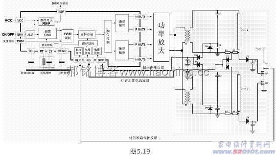 保护控制电路的作用,就是将高压输出电压取样信号、CCFL灯管电流取样信号及灯管断路取样信号反馈至振荡控制电路,通过比较电路和基准电压进行比较;当取样信号异常时,控制振荡控制电路关闭输出,背光板进入保护状态。保护控制电路的取样如图5.19所示。