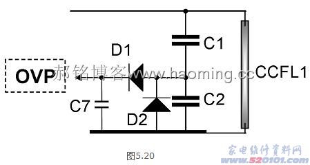 CCFL1灯管的电压取样由C1、C2、D1、D2、C7完成,局部电路如图5.20所示。其主要作用是,当某只灯管出现过压现象时,促使前端电路进行保护控制。