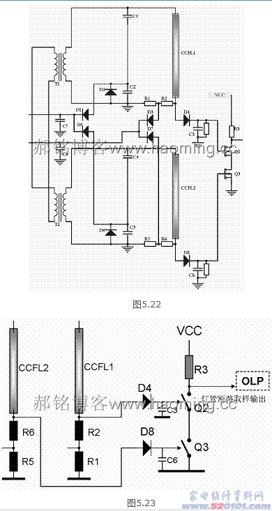 图5.22中,涉及灯管断路取样的元件有R1、R2、D4、C3、Q2、Q3、R3、D8、C6、R5、R6等。R1、R2是CCFL1灯管的电流取样电阻(因为灯管断路保护要求其取样电压高于电流取样电压,所以R1、R2串联取样),取样结果经D4、C3整流滤波后输出至“与门”电路Q2的栅极;R5、R6是CCFL2的电流取样电阻,取样结果经D8、C6整流滤波后输出至“与门”电路Q3的栅极。