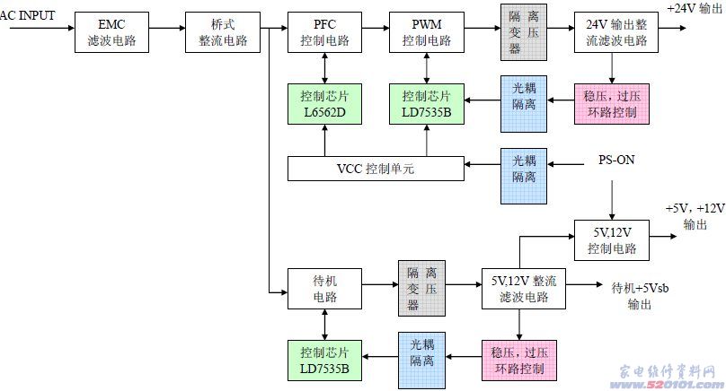 ①开机: 当主机的控制信号PS-ON通过CON4的5脚送一个高电平信号时,经 R85、R86输送到Q7的基极,Q7导通,光耦P2的1脚和2脚导通,由于耦合感应作用,4脚和 3脚导通,Q6随之导通,T1反馈绕组输出的VCC电压,随着Q6的发射极和集电极的导通,输出VCC1,分别给 IC3(LD7535BPL)的 5脚和 IC1(L6562D)的8脚提供VCC电压,从而使IC3、IC1开始正常工作。