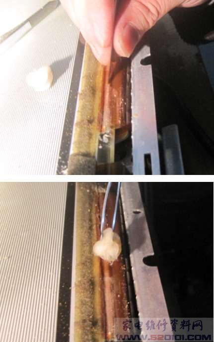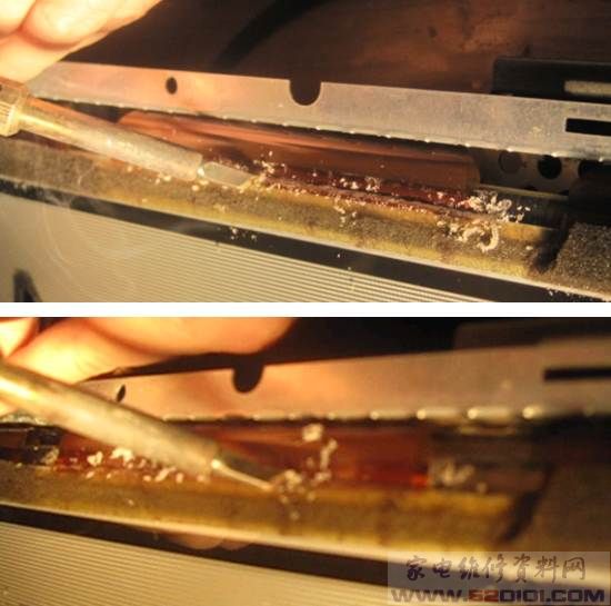 用烙铁清除上面的胶,记住这里千万不要加天那水,这样会使排线变形,将无法对位。