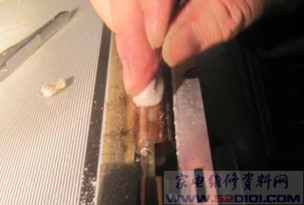 接着竖着刮,边刮边加天那水。天那水的作用是使其软化,刮的时候不要太大力,小心将引线刮断,如刮断引线将无法再修复。只有报废。这一步将用时两个小时。要非常小心,是关键的一步成败在此一举。