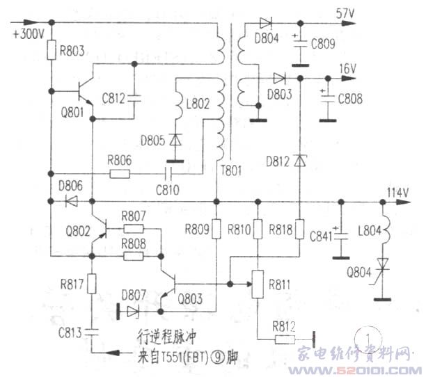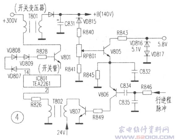 第六类:需行逆程脉冲锁频,间接取样的他激式并联型开关电源,如采用电源控制IC TEA2261(我国熊猫C74Pxx系列彩电均采用这种开关电源)。这类开关电源在启动后,来自行扫描电路的行逆程脉冲锁频,且加至自动电压调节电路(见图4),通过调节激励脉冲的占空比来实现稳压。由图可知:来自FBT的行逆程脉冲经R846、C835积分形成行频锯齿波信号,送至V806 b极。V805、V806组成脉宽调制电路,V806c极输出的是经过调制的行频方波信号,方波信号的占空比由V806 b、e间电压决定。方波信号由V807倒相、放大后经反馈变压器T802耦合到TEA2261②脚,激励电源振荡。当+B电压偏高时,V805 b极电压升高,因V805 e极为恒定5.8V,故V805 c极电压降低,即V806 e极电压降低→V806 c极输出的行频方波信号占空比减小→经V807倒相放大及T802耦合后形成的反馈激励脉冲占空比也减小→开关管V801导通时间减小→+B电压下降。反之亦然。显然,行逆程脉冲不仅对开关电源锁频,而且还参与了振荡稳压(即间接取样作用),因此,如果断开行扫描电路接假负载试机,开关电源输出电压必将大幅降低。另外,不少利用厚膜块TEA2164、TEA2280构成的开关电源及法国汤姆逊TFE5114DK彩电开关电源也是利用行逆程脉冲参与开关管的脉宽调制,故这类开关电源也不宜断开行扫描电路接假伍载来判断开关电源是否正常。