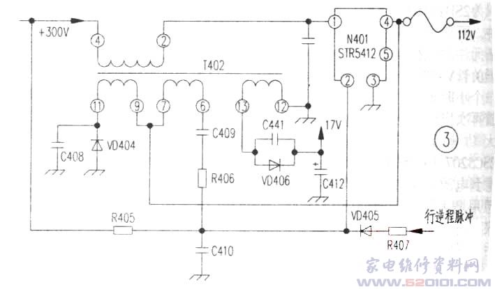 第五类:需行逆程脉冲辅助激励的串联型开关电源,如采用电源厚膜块STR5412、STR-D5095A、STR6020S(见图3)等构成的开关电源,这类开关电源引入行逆程脉冲不仅使开关管工作频率与行频同步,而且还是开关管反馈网络的一部分。这类开关电源的工作过程是:开机后开关管启动自由振荡,但只能产生额定输出电压的40%,此电压送给行扫描电路,使行扫描电路启动,产生的行逆程脉冲又送给开关管b极以辅助开关管迅速进入行频工作状态,这时开关电源才输出额定电压。这种电源有两个好处:一是有降压保护功能,一旦行负载有开路或不太严重的短路故障,开关电源输出的电压只有正常值的60%左右,使损坏范围不至于扩大;二是使电源和行扫描电路具有短时间的软启动功能,有利于减少电源和行扫描电路的故障率,此类电源若去掉送给开关电源的行逆程脉冲,则电源输出电压将下降40%~60%,甚至更低(接假负载时测定),因此这类电源不宜断开行负载而接假负载来判断开关电源是否工作正常。因为即使电源正常,它输出的电压也会明显偏低,所以最好使用外接电源单独给行扫描电路供电。若行扫描电路工作正常,说明电源有故障。