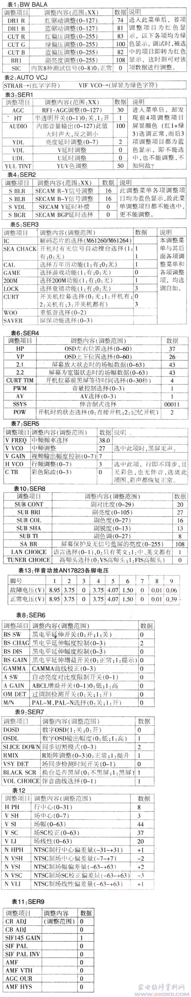 总线的进入:在TV或者AV状态下,先按遥控器上的“菜单”键,待屏幕上出现菜单显示期间,再依次按遥控器上的数字键“6”、“4”、“8”、“3”,原屏显菜单即时消失,转而出现“AFC”屏显字样。此时,表明已进入了工厂调试状态。在此状态下,重复一次上述操作,便可进入白平衡调整菜单(BW BALA),此菜单的调整项目及相关数据见表1。在进入白平衡调整菜单后,再重复一次上述操作,屏显菜单见表2。在屏显表2状态时,依次按遥控器上的数字键“1~9”,则可进入“SER1~SER9”项调整菜单,调整资料见表3~表11。