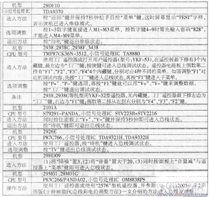12种熊猫CRT彩电I2C总线彩电的调整方法 2015-01-13 20:44:09 阅读 282 次 评论 0 条 摘要: 此资料适用于以下机型机型21M01、21M05G、21M06 机型29M06、29MF08H 机型25M05G、25MF08、25M08G、25M09、29M01H、29MF08G 机型2906、29MD01 机型3 此资料适用于以下机型机型21M01、21M05G、21M06 机型29M06、29MF08H 机型25M05G、25MF08、25M08G、25M09、29M01H、29MF08G 机型2906、29MD01 机型3468、3468A 机型2990 机型29DF10 机型2938、2938C、2938F、3438 机型2101A 机型2926E 机型29HD09 版权声明:本文为转载文章,版权归原作者所有,欢迎分享本文,转载请保留出处! 点赞 分享: PREVIOUS:海信TC2518KB彩电开机呈三无,但能听到机内传出的“嗒嗒”声 NEXT:创维数码8000V-2108彩电总线故障检修 文章导航