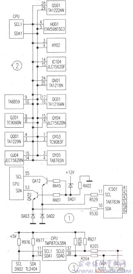 为了说明与常规彩电中硬件故障的不同,我们将I2c总线彩电中的硬件故障分为两类:第一类硬件故障与常规彩电相同,而且故障并不影响I2C总线系统。比如:电源电路故障,行输出电路故障等。这类硬件故障的故障现象及检修方法与常规彩电相同。第二类硬件故障的产生会对彩电的I2C总线系统产生影响,从而出现某些常规彩电中不会出现的故障现象。这类故障通常包括:I2c总线的SCL或SDA对地短路,SCL与SDA之间短路,CPU的SCL相SDA端门发牛开路,I2C总线受控电路电源故障及受控集成电路故障等。此类故障在电路上最明显的特征就是I2c总线电压发生异常,因此,通过检查I2C总线电压的变化即可对第二类硬件故障作出判断。以下举例说明。