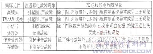 该机为自动复制方式,更换存储器后重新开机,CPU就会进行复制程序,并将CPU内ROM中的数据通过总线写入存储器中。I2C总线彩电某些硬件损坏时,可能会出现以下一些特殊的故障现象。(1)开机三无,电源指示灯亮;(2)机内继电器发出通断的“嗒嗒”响声;(3)开机即自动关机保护;(4)白光栅(或暗光栅、无噪点),按键及遥控均失灵;(5)黑屏(无光栅,但显像管灯丝亮,有高压)。附表中列出了普通彩电与I2c总线彩电中的一些部件损坏后可能引起的故障现象。从附表可以看出,当挂在I2C总线上的被控电路损坏后,会引起一些有违常规的故障现象,应特别注意。