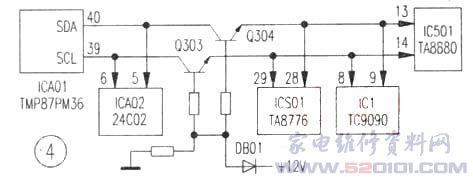 试将继电器短接强行开机无效,说明I2c总线存在故障。该部分电路如图4所示。测CPU 39、40脚电压在0V~5V之间变化,测Q303 e极电压也在0V-5V之间变化,而Q304 e极电压为0V。关机,测Q304 e极对地电阻值,正反向电阻值均为0Ω。怀疑某受控电路不良。逐一断开各受控电路进行观察,当断开伴音集成块TA8776时,Q304 e极对地电阻值恢复正常(10k左右),检查发现ICS01(TA8776)28脚(SDA)对地短路。