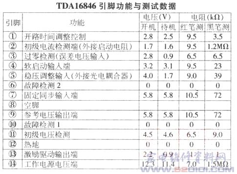 TDA16846是飞利浦公司研制开发的开关电源控制芯片。具有诸多优点:(1)独立的振荡电路,振荡频率根据需要有固定模式、自由调整模式、同步模式,供没计选择;(2)具有过流、过压、欠压等保护功能,保护功能完善、灵敏、可靠;(3)有两路稳压控制调整输入;(4)具有软启动功能;(5)小电流、低电压启动方式,防止对功率开关管的冲击。输出端口,根据需要没计,可以激励场效应管,也可以激励双极型功率晶体三极管。