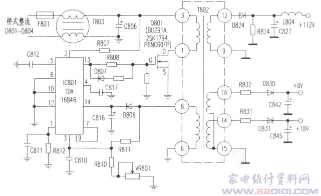 附图所示电路为TDA16846在TCL-2135A彩电开关电源的应用电路图(其他机型与此大同小异,下述检修以此图为参考)。