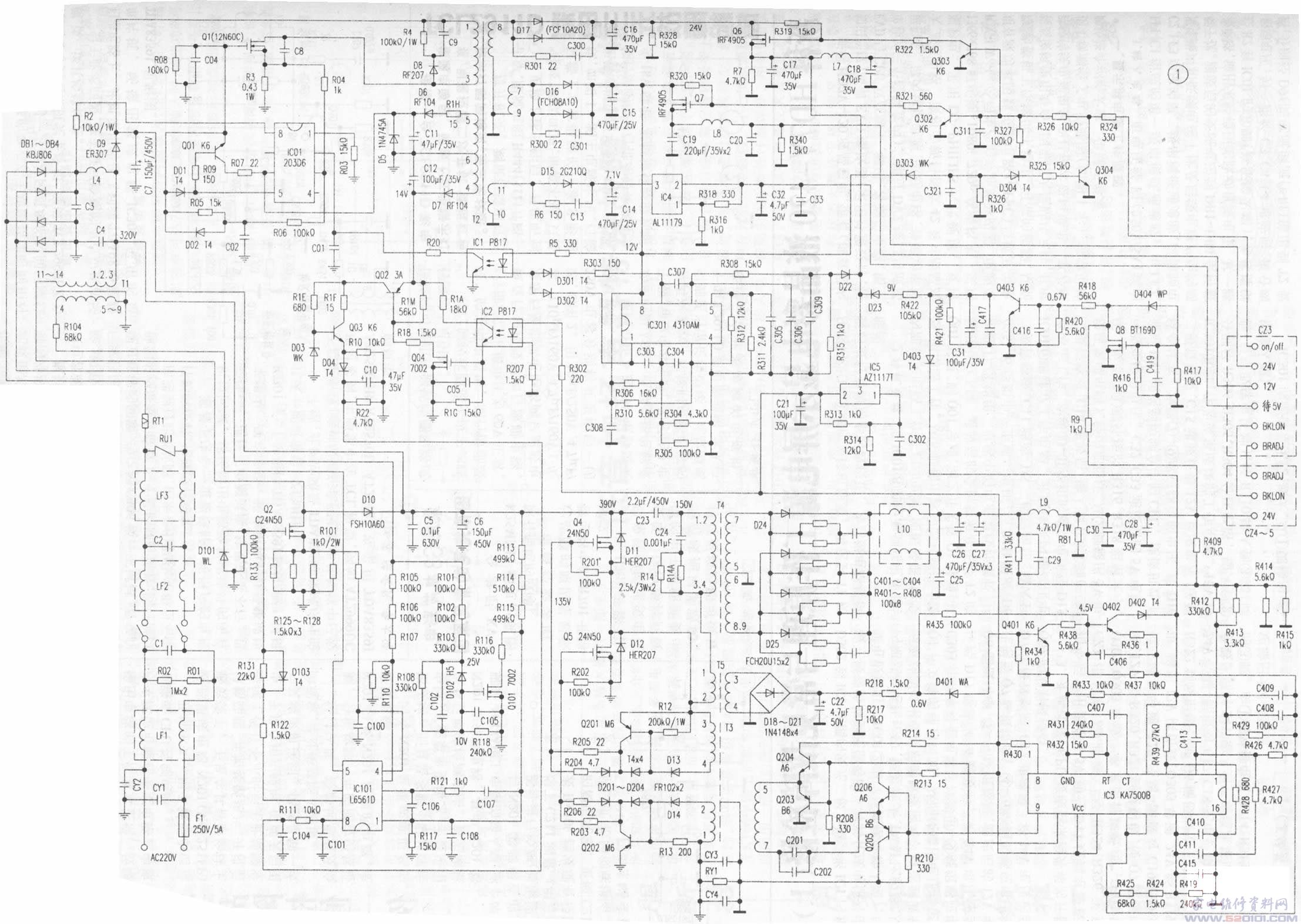 1.输入电路市电压经F1(250V/5A)到由LF1、C1组成的第一级串模低通滤波;由LF2、C2、LF3组成的第二级串模低通滤波,以抑制电网中噪声和低频电磁干扰及后级电路产生的高频干扰。滤波后的交流电送到DB1~DB4全桥整流电路,输出未经稳压的脉动直流电压。其一路经R2到IC01的⑧脚(高压输入端),为其提供启动电压;另一路经C3、C4、L4滤波后,再分两路;分别经D9(防电流倒流作用)输出到T2变压器初级①~③脚作为待机能源;再送到T1初级后进行有源功率因数校正,为后级电路提供能源。