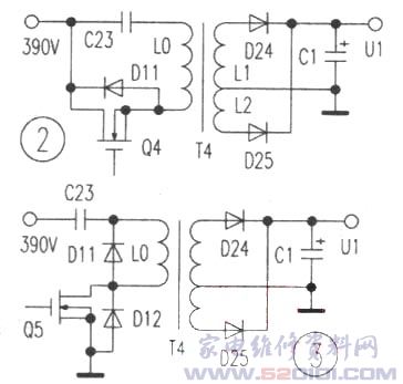 此电路由Q4、Q5、c23、T4、T3、IC3、D24、D25等组成PMW谐振变换电路。全桥整流电压经APFC电路处理后,在C6两端产生的390V直流电压送到隔直电容C23与Q4漏极的公共端,由IC5经内部稳压后,输出16V电压送到IC3(KA7500B)集成电路12脚电源端,IC3工作。其14脚输出5V基准电压;13脚输出方式控制与14脚相连,处于高电平状态。当13脚处于低电平时,内部两只驱动管处于截止状态;若为高电平时,两只驱动管交替导通,输出脉宽调制信号;④脚为死区控制,当④脚电压升至5V时,脉宽输出为零;⑤、⑥脚分别外接定时电容与定时电阻,其值决定IC3的工作频率;①、②脚与15、16脚为两个放大器的输入端(调节输出脉冲宽度);由⑨、⑩脚分别输出调制信使T3的⑤-⑦绕组工作并在次级的③-④与①-②绕组感应出电压。设Q4的栅极首先获得感应电压,Q4导通(图2为等效图),c23与T4初级带电工作,并以正弦波谐振频率变化,当振荡电流为零时,Q4关断。L0与c23中的能量通过谐振,使D24、D25导通后对C1充电(向背光灯供电),D11为钳位二极管。当D12负端电流跌到零时,D12导通,使Q5漏一源钳位为零。Q5导通(图3为等效图)。390V电压通过隔直电容c23,使T4初级L0中电流增长,并存储能量;当Q5截止时D11钳位,将反峰电压向电源释放。电路中的能量通过T4转化使D24、D25导通后对C1充电(向背光灯供电)。R14、R14A在Q4与Q5交替导通前将T4中剩磁吸收掉。