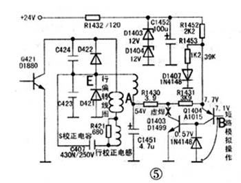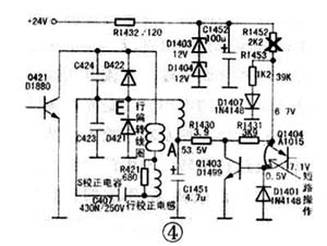 开机测得A点电压为53.5V,偏高(正常值为23V左右);B点电压为7.1V,正常;C点电压2.5V,正常。 例4:TCL2509SZ型机,行幅缩小且枕形失真。