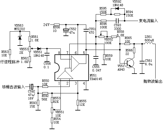 场锯齿波电压经C592、R550送至N551的(2)脚,经IC内部放大限幅并作波形处理后在7脚形成上凸的场频抛物波电压,同时加至内部运放的反相输入端与8脚输入的行频锯齿波电压经运算并经倒相驱动后由N551第5脚输出,形成下凹的场抛物波电压(幅度受场频抛物波电压调制的行脉冲).此电压V551放大后,经L561输出场抛物波电压。 图中的VR552为枕型失真校正量调节电位器,调节它实质上是改变了N551的5脚输出信号反馈到7脚的负反馈量,也就改变了5脚输出的抛物波电压幅度,使校正量适中,使光栅保持矩状不失真状态。 VR553为行幅度调整电位器,由行输出变压器送来的行脉冲信号经R562和VD563的切割后形成纯18Vp-p的脉冲,通过VR553调节后,经VD551与C556的积分作用形成行锯齿波电压加至IC361的8脚,调节VR553即可改变8脚输入脉冲的幅度,也就改变了5脚输出的行脉冲电幅度。 VR551是光栅梯形失真校正电位器,调节它即改变了N551的1脚的直流电位,从而改变了内部运放输出的抛物波斜率,达到校正梯形失真的作用。 |