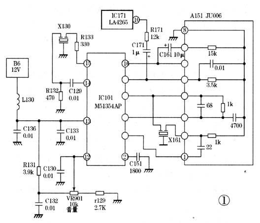 | 例1:孔雀KQ47—39型彩电晴天声音正常,阴雨潮湿天,刚开机时声音从无到嘶哑,约半小时后自行恢复正常。 该机采用三洋83P机心,从检修实例中发现伴音部分故障率较低,相关电路如图1所示。检修时用镊子碰触功放集成块ICl71(LA4265)音频信号输入端⑩脚,喇叭中发出较大的“嗡嗡"声,说明功放部分正常,怀疑故障出在伴音中频部分。在伴音失真时,测得中放集成电路ICl01(M51354AP)(12)~(19)脚电压正常,只有伴音中频输出端(20)脚电压约为3V左右波动不定,(20)脚正常电压应为4.6V。断开厚膜电路A151(IU006)①脚与ICl01(20)脚的连线,ICl01(20)脚电压正常,用万用表测A151①脚对地电阻,阻值不停地变化,正常阻值应为无穷大,将A151拆下,发现①、②、③脚之间有黑色油烟,用酒精清洗干净后,再测A151①、②脚电阻为无穷大,重新装上后声音正常。 例2:孔雀KQ47—39型彩电,有时声音正常,有时无声。 电原理图如图1所示