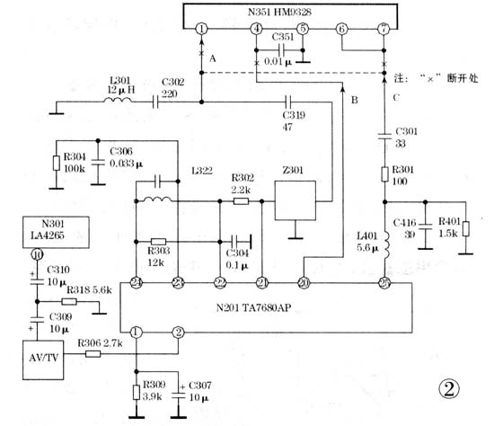 测得中放集成块N201(TA7680AP)①、②、⑨~③脚电压正常。一般情况下此机声音失真大多是伴音中周L322(D0149)内附电容异常所致,换新调整后即可。于是拆下L322,发现内附小电容确已发黑,换新L322,反复调节,均无明显效果,又检查⑧国脚外围元件也未见异常。此机与夏普NC一2T型机心伴音部分有所不同。它增加了一块厚膜集成块N351(HM9328),将其引脚与印制板脱开(如图2中的“×”),在A、C之间用一导线短接(如图2中虚线),调节伴音中周I,322,伴音恢复正常,说明N351已损坏,在暂无N351时,这样应急修理也可以使彩电恢复正常。 例4:熊猫3608A彩电图像正常,音量小,但不失真。相关线路如图3所示