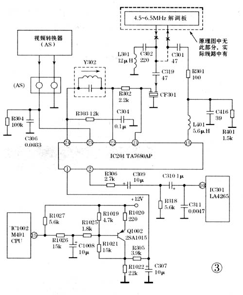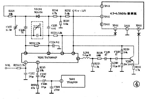 IC2()1⑧脚是去加重,此脚又作为AV音频信号输入端。检修时将AS板插头拔下,声音一切正常,说明故障原因在视频转换板上,目测发现视频转换板上三极管Q906b极脱焊,将其补焊好后,插上AS插头,伴音恢复正常。 例5:熊猫36()8A彩电,音量正常,只是伴音中夹有刺耳的“吱吱"噪声。 拆开机壳,发现IC201(TA7680AP)、T302(D0149)、行输出变压器等元件都已换新。电路同图3,通电试机,用遥控器将音量调小,喇叭无声,调大音量,噪声与伴音同时增大。这说明CPU与功放部分都正常,故障应在伴音解调,测集成块Ic20 1①、②、⑨~③脚电压都正常。为了确定噪声的来源,用10μF/16V的电解电容分别将IC201的①脚和地短接时,噪声立刻消失,伴音正常。拆下滤波电容C307(10IμF/16V),测量已失效,更换后,故障排除。 例6:熊猫54P3A彩电,图像正常无伴音。 该机是一台全制式彩电,自动解调4.5-6.5MHz,因此伴音电路比较复杂,如图4所示