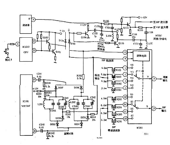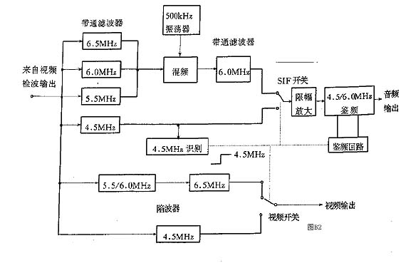 要实现自动控制的关键是4.5MHZ的识别电路.来自视频检波器输出的信号通过4.5MHZ带通滤波器送至4.5MHZ识别电路,当输入的第二伴音中频为4.5MHZ时,识别电路输出高电平(TA8615N),用此识别信号分别去控制SIF开关,视频开关及伴音鉴频回路参数,如果第二伴音载频非4.5MHZ那么经6.5MHZ,6MHZ或5.5MHZ带通滤波器取出送入混频器(TA87件0S)与500KHZ振荡信号进行混频,输出6MHZ的第二伴音中频再通过6MHZ带通滤波器送入鉴频电路(TA7337)从而解调出伴音. |