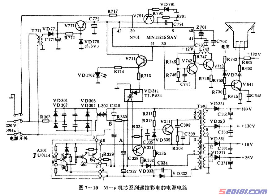 M-μ 机芯的遥控电源及开/关机控制电路见图 7-10 上半部分所示。 如图,按下总电源开关 S901 以后,电视机电源接通,电视机进入正常工作状态。同时