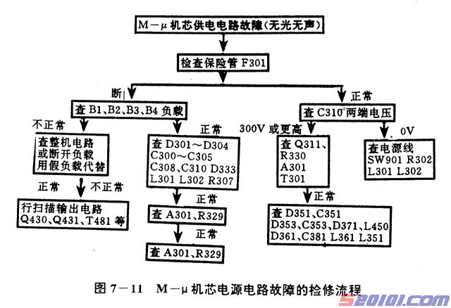 在检修 M-μ 机芯系列彩电视机“三无”故障时,有两点需要注意: 其一,有的机型“三无”故障,保险丝 F301,开关管 V311 和电阻 R302 都正常,只有电[Page]