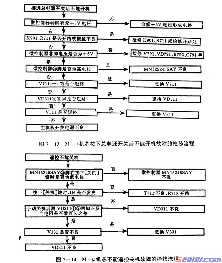 在 VD311 的(1)、(2)脚,电视机也将处于“待机”状态;最后应检查复位电路,若 V791 开路, 则微处理器的(8)脚始终为 0V,复位状态无法消除,微处理器 MN15245SAY 无法启动,电 视机无法开机。具体检修步骤与方法可按图 7-13 所示的流程进行。