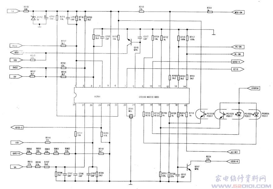 M5V-ON信号到IC701。IC701输出控制信号加到5V,5VSC,16V,9V,使低压输出,当IC701检测到低压输出正常后,19脚发出PFC-ON信号到PC153,使PFC芯片得电工作,PFC工作后,IC701 20脚发出低电平到PC802,使VS形成电路得电工作。输出VS,接着输出VA,完成整个开机过程。