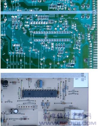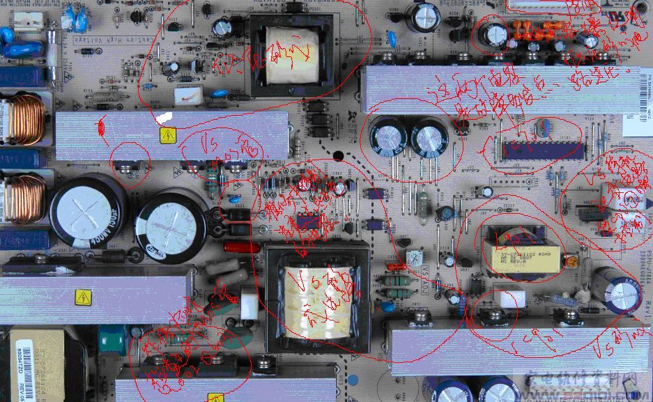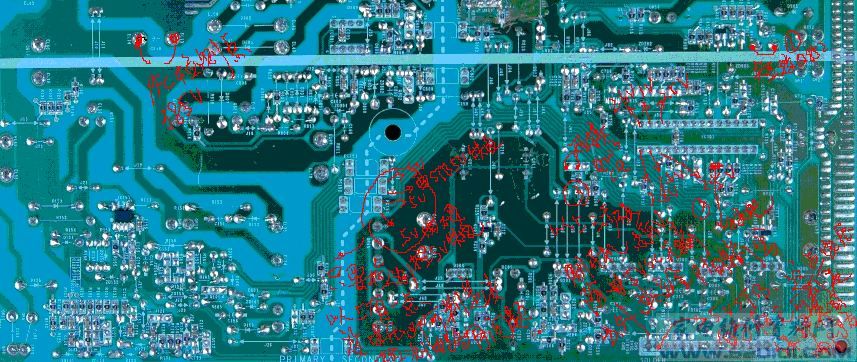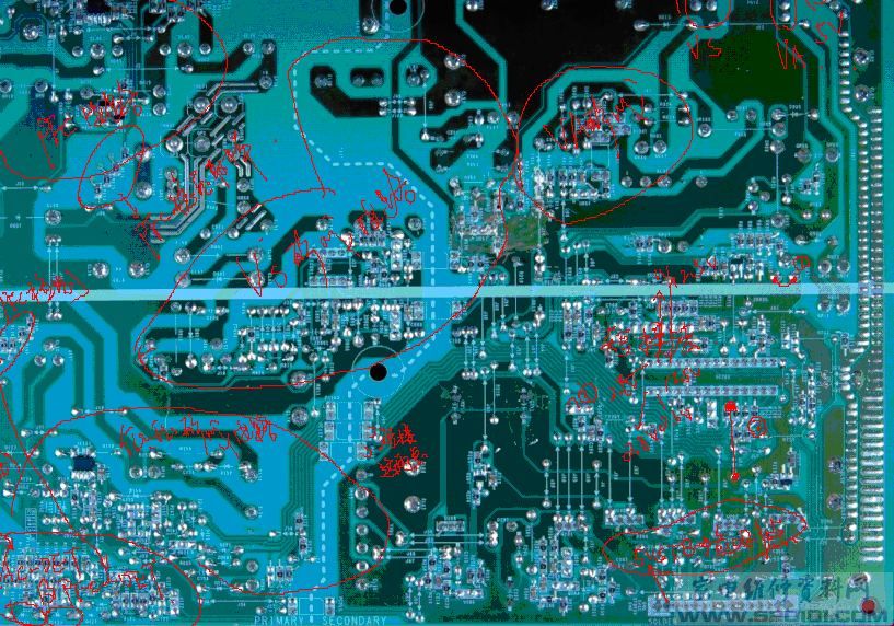 该部分电路中,较少出现故障,主要有死机。主查供电5V,复位和晶振,其次是芯片本身坏。还有一部分故障就是VS和VA检测电路中的一串电阻,因为这些电阻在安装时下面都有胶水固定,时间长了这些红色的胶会漏电,导致检测电压不正常而保护。这一点在PFC电路中表现得尤为突出,几乎成了通病。而且这一通病一直延续到了液晶电视电源。可以说只要制作工艺不发生根本改变,这个通病还要延续下去。