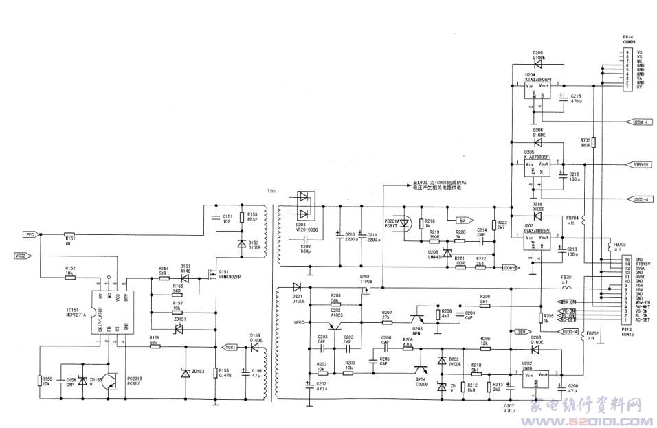 这部分电路相对比较简单,维修时要明确控制电路的控制过程。IC701 8脚控制U204 5V,10脚控制5VSC,16V和9V。都是二次开机后才起控才有电压输出。而25脚控制的U205输出5VSTB,在待时就有起控,但要特别注意的是,当AC-DET出现过压和欠压。PFC出现过过压时,IC701通过25脚会关闭5VSTB输出。所以,当我们检测到D204有6。5V电压。而5VSTB没有输出 时,首先要检查AC-DET和PFC-DET电路。这时可短接PC151和PC152的3脚和4脚来判断。如果短接后,各路电压输出正常,则查AC-DET,PFC-DET电路,而当检查只有5VSTB输出,而其它输出没有时,说明几路输出5V,5VSC,16V,9V,VS,VA,某一路不正常引起保护,这时也可采用去保护的方法。方法后述。