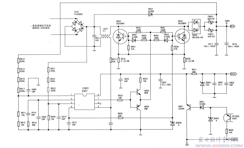 首先看它的受控部位,IC701 19脚输出低电平,使PC153导通,控制Q601导通,VCC1 18V电压加到IC601 8脚15V,PFC电路开始工作,从7脚输出PWM脉冲,经Q604,Q605灌流,加到Q602,Q603。Q602,Q603等效于一个开关,这是一个典型的升压型电路。从输出端输出396V的稳定的PFC电压。