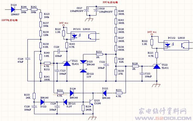 2,PFC正常工作时,U122 R端维持在2。5V电压,PC152导通。有正常电压输出。当PFC过压时,ZD122负端电压达到11V时,ZD122齐纳击穿Q121饱和导通,使PC151,PC152同睦截止。关闭所有输出。包括5VSTB。当PFC欠压时,U122 R端分压低于2。5V,则PC152截止,IC701 19脚为低电平,关闭输出电压,只保留5VSTB输出。