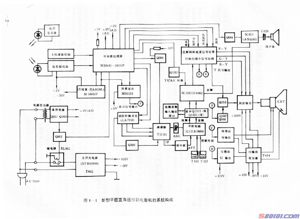 国内外各类新型平面直角彩色电视机,虽然在电路程式与元器件的选用上不尽一致,但万变不离其宗,其基本电路构成是一致的,都是由电源供给系统,遥控系统,高中频信号通道系统,色解码系统,行场扫描同步系统及彩色显像管等单元构成.整机的系统构成如图1-1所示(以长城CJC532型机为例,以下均同).