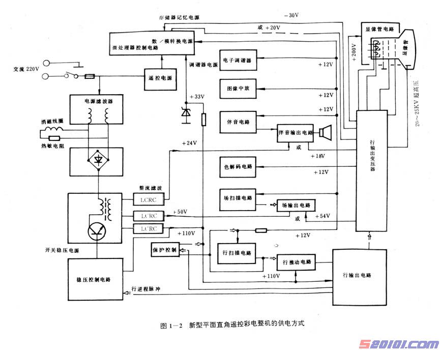 从图1-1和图1-2中可知,国内外新型平面直角遥控电视机的供电系统由三部分组成;一是遥控电源,也叫辅助电源,副电源或备用电源,它是在遥控开关机或待命状态时,向微处理控制器电路提供电能的工作电源;而是主开关电源,也叫一次电源,它是将交流市电直接整流并经开关稳压电路稳压调控后,向行场扫描及伴音功放与场输出等大功率电路提供120V(110V~145V左右的主工作电源;三是高中频信号通道及显像管各极的工作电源,也叫二次电源,它是由行扫描电路利用一次电源提供的120V左右电压,通过行输出变压器,将扫描工作过程中的逆程脉冲进行变换与升压,为彩色显像管的阳极提供25KV以上(如松下TC-29V2H机就达31KV)的超高压,为聚焦极提供数千伏的副高压,为视放末级提供190V左右的中压,为显像管灯丝提供6.3V左右的脉冲电压;为图象及伴音通道提供12V的低电压;为调谐器提供30V左右的调谐电压;为微处控制系统的存储器提供-30V左右的工作电源。