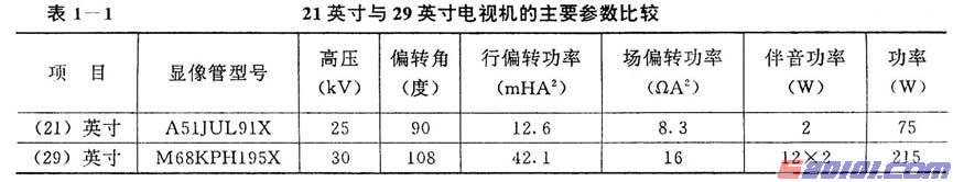 同中小屏幕电视机的电源电路一样,平面直角遥控彩色电视机电路的作用是把交流电源转换成整机电路所需的各种直流电压。不同的是平面直角遥控电视机显像管工作电压高,偏转角大,所需偏转功大;伴音输出功率加大,所以电源供给的功率要增加。54cm(21英寸)电视机和74cm(29英寸)电视机的各种参数比较表如表1-1所示。所以在设计电源电时,要重视提高电源的效率。