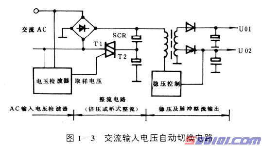 如图l一3,它主要由电压检波器和三端双向可控硅开关(SCR)元件等组成。电压检波器对输入交流电压自动检测,输出切换取样电压。双向可控硅等效为一个受控的双向开关。通常,当切换取样电压大于160V时,整流二极管组、双向可控硅和两个滤波电解电容组成的整流器进行桥式整流;当切换取样电压小于160V时,该整流器进行倍压整流。经整流器输出的直流电压经开关型稳压电路稳压,最后输出稳定的直流电压。这里,电源自动转换的核心器件是双向可控硅,它可根据交流输入电压值的大小(在本电路为取样电压),进行整流方式的选择,即采取倍压整流还是桥式整流方式。具体工作过程如下见第二章和第八章中的有关章节。