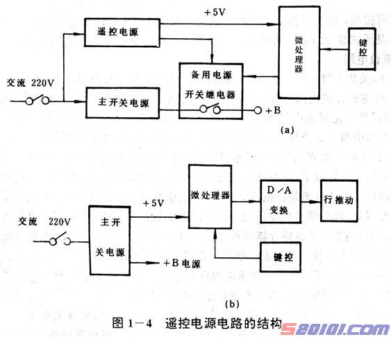 图1—4(b)所示的遥控电源电路是和主开关稳压电源结合在一起的,微处理器所需的+5V工作电源,则直接由开关电源提供,整机的开/关状态(即待命状态)是由微处理器输出控制指令去控制行扫描电路的起振与否,而使整机处于工作或待机状态。这类遥控电源电路的特点是:实现了电子控制无触点式软启动,但在“待命”状态(即暂停状态)仍消耗20%左右的电能。