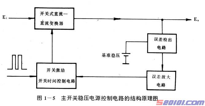 如图1—5,它主要由开关式直流——直流变换器、开关激励电路及开关时间控制电路等部分组成。其核心部分是一个开关式直流——直流变换器。其基本工作过程是:输入电压E是电网电压经整流、滤波后获得的脉动直流电压,开关式直流——直流变换器将输入的Ei变成有一定占空比的脉冲电压,再将其整流得到输出电压Eo。为了使Eo稳定,将它与一基准电压进行比较,检出其变化量厶Eo,经放大后送到开关时间控制电路,通过调整开关脉冲的占空比得到稳定的直流输出电压Eo。 ’ [Page]