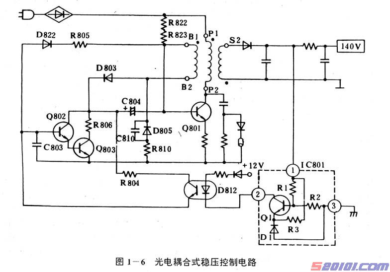图中D812是光电耦合器,它是由一只发光二极管和一只受光控的光敏三极管组成。其中光敏三极管的导通电流受发光二极管的发光强弱控制。当发光二极管正向电压增大时发光增强,使三极管导通电流增大,内阻减小;反之,发光二极管正向电压减小时发光减弱,使三极管导通电流减小,内阻增大。这样光敏三极管就成了一个受发光二极管发光强弱控制的可变电阻。这个可变电阻加到取样放大管Q802集电结,以控制Q802的导通电流,进而控制开关管的导通时间,从而完成稳压作用。而控制发光二极管发光强弱的电压又是通过取样集成块IC801取自+B(140V)输出电压。为了防止输入交流电源电压的变化及负载的变动引起+B电压不稳定,通过对+B电压的检测和对切换稳压电路的控制,使输出电压保持不变。工作过程如下:如某种原因使+B电压升高,则IC801的Q1的基极电压升高,Ic增加,光电耦合器D812的电流增加,导致Q802基极电压升高,集电极电流增大,Q803的集电极电流也增大。这时C804的放电加快,其对Q801基极的影响提前消失,导致加速回复到起始状态,在S2绕组感应的正脉冲周期相应变短,结果使+B电压呈下降趋势,最终保持输出电压不变。同样道理,当+B电压降低时,工作过程与上相反。