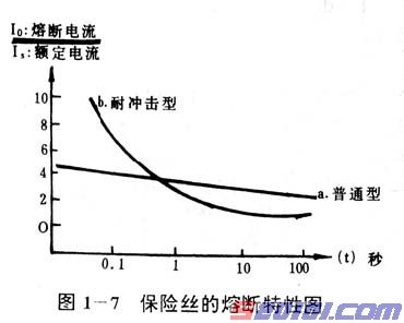 最简单的过流保护电路是在供电电路中串接保险管或保险丝电阻。当流过它的电流超过一定限值(一般为其额定工作值的数倍)后,保险丝或保险丝电阻熔断,切断供电,阻止故障进一步发展。因此,它是十分重要的安全元件。然而由于消磁电流及开机时的浪涌电流等原因,开机的瞬间出现十数倍于正常工作电流以上的瞬间电流,普通保险丝很难适应这种要求。普通保险丝与耐冲击型保险丝熔断特性见图l一7中曲线所示。 [Page]